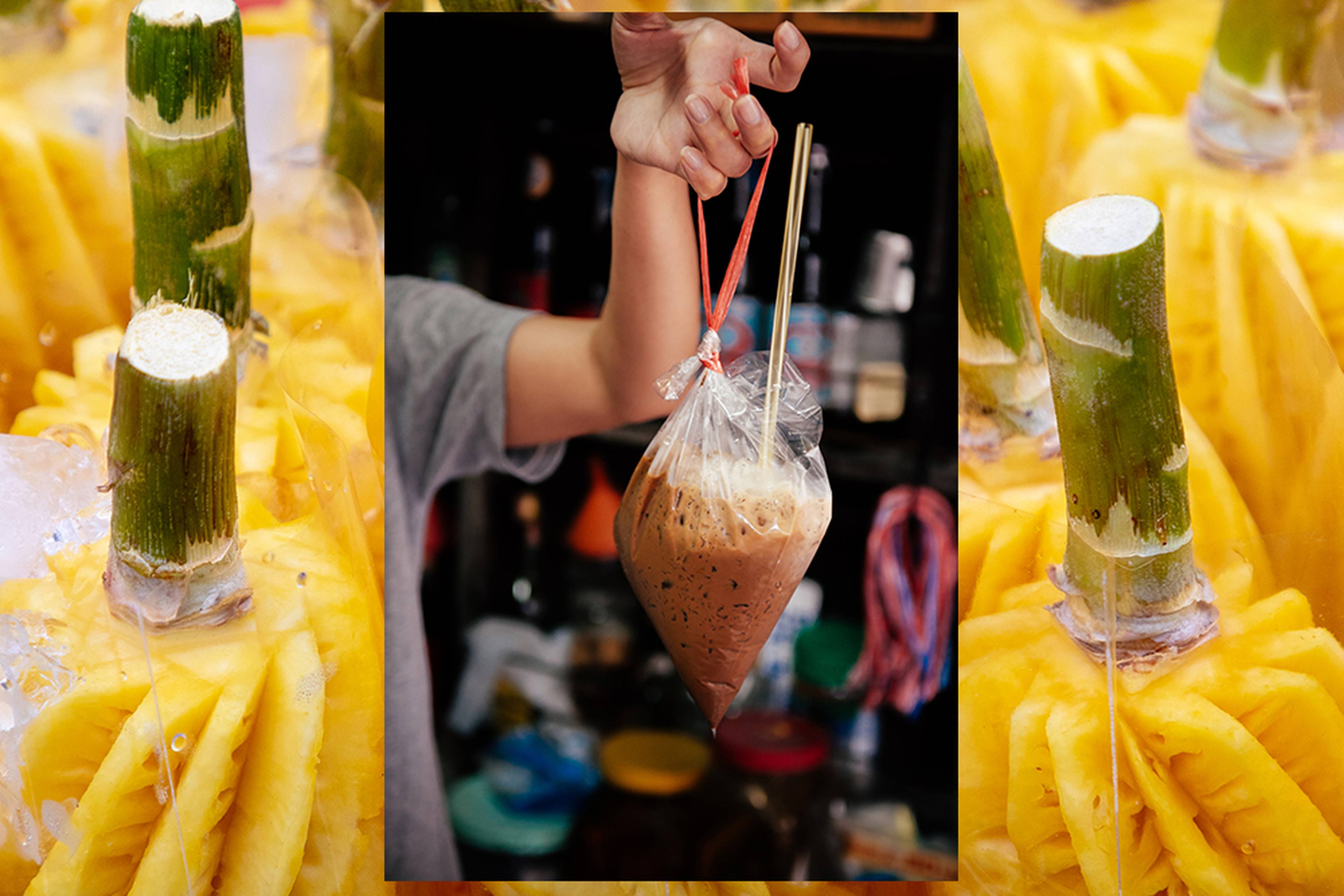 Start your day the Thai way To beat the Bangkok heat, Alec recommends a plastic bag (you read that right) of Thai iced coffee, or oliang. Thailand street food vendors typically mix it with condensed milk and simple syrup before serving it up in a bag for easy sipping on the go.